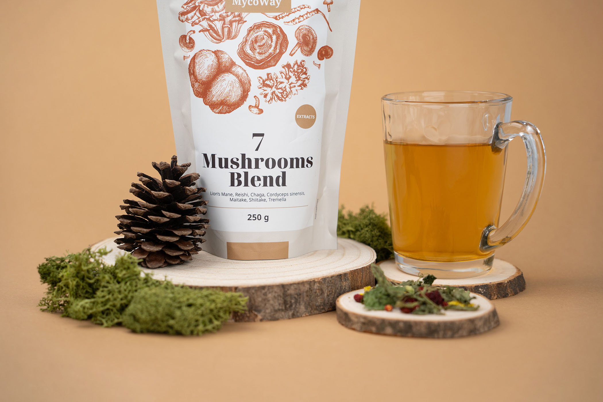 Zloženie: výťažok z levej hrivy (Hericium erinaceus) 12:1 vo forme prášku, výťažok z reishi (Ganoderma lucidum) 4:1 vo forme prášku, výťažok z chagy (Inonotus obliquus) 12:1 vo forme prášku, výťažok z Cordyceps sinensis 12:1 vo forme prášku, výťažok z maitake (Grifola frondosa) 4:1 vo forme prášku, výťažok z shiitake (Lentinula edodes) 4:1 vo forme prášku, výťažok z tremelly (Tremella fuciformis) 4:1 vo forme prášku.