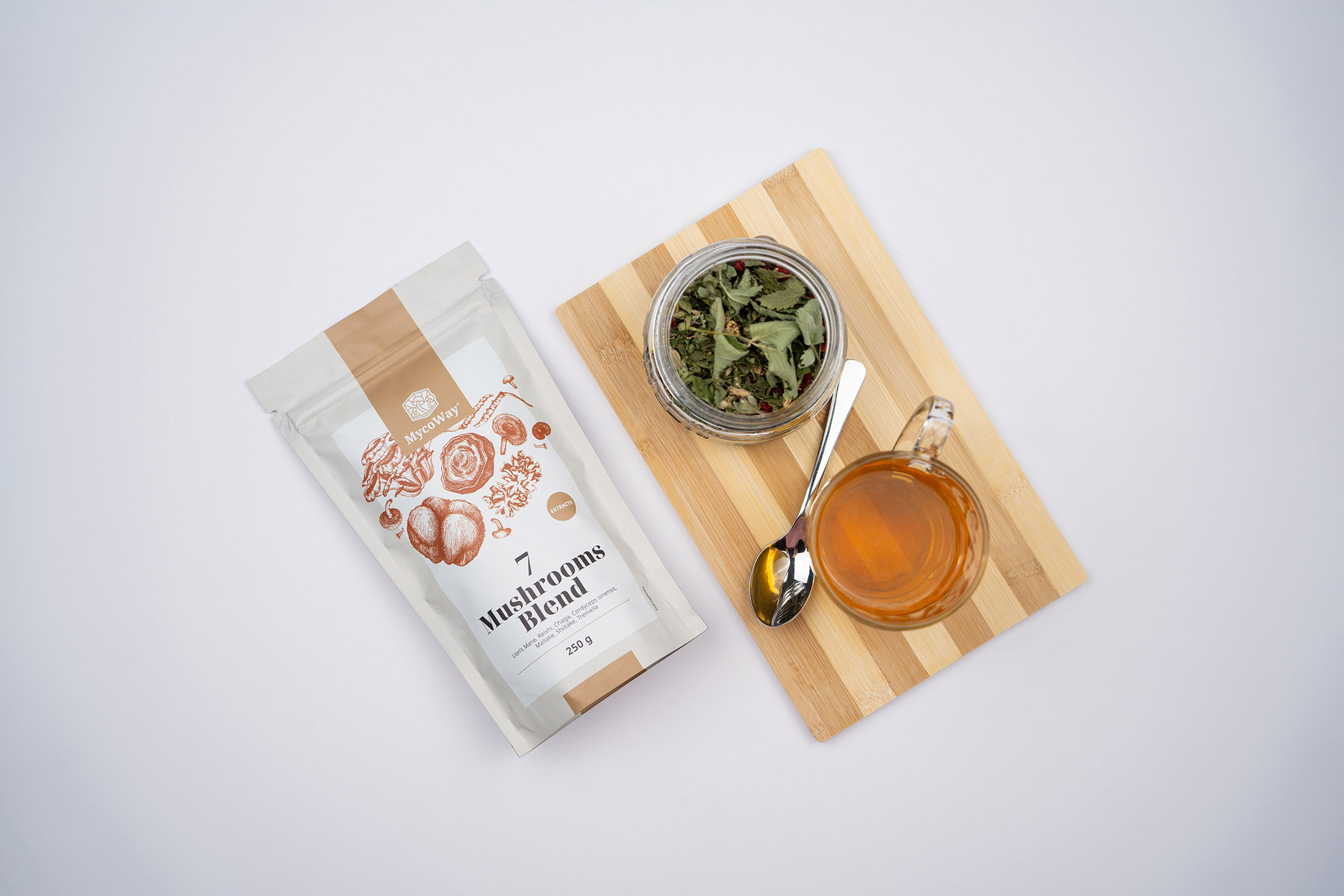 Zloženie: výťažok z levej hrivy (Hericium erinaceus) 12:1 vo forme prášku, výťažok z reishi (Ganoderma lucidum) 4:1 vo forme prášku, výťažok z chagy (Inonotus obliquus) 12:1 vo forme prášku, výťažok z Cordyceps sinensis 12:1 vo forme prášku, výťažok z maitake (Grifola frondosa) 4:1 vo forme prášku, výťažok z shiitake (Lentinula edodes) 4:1 vo forme prášku, výťažok z tremelly (Tremella fuciformis) 4:1 vo forme prášku.